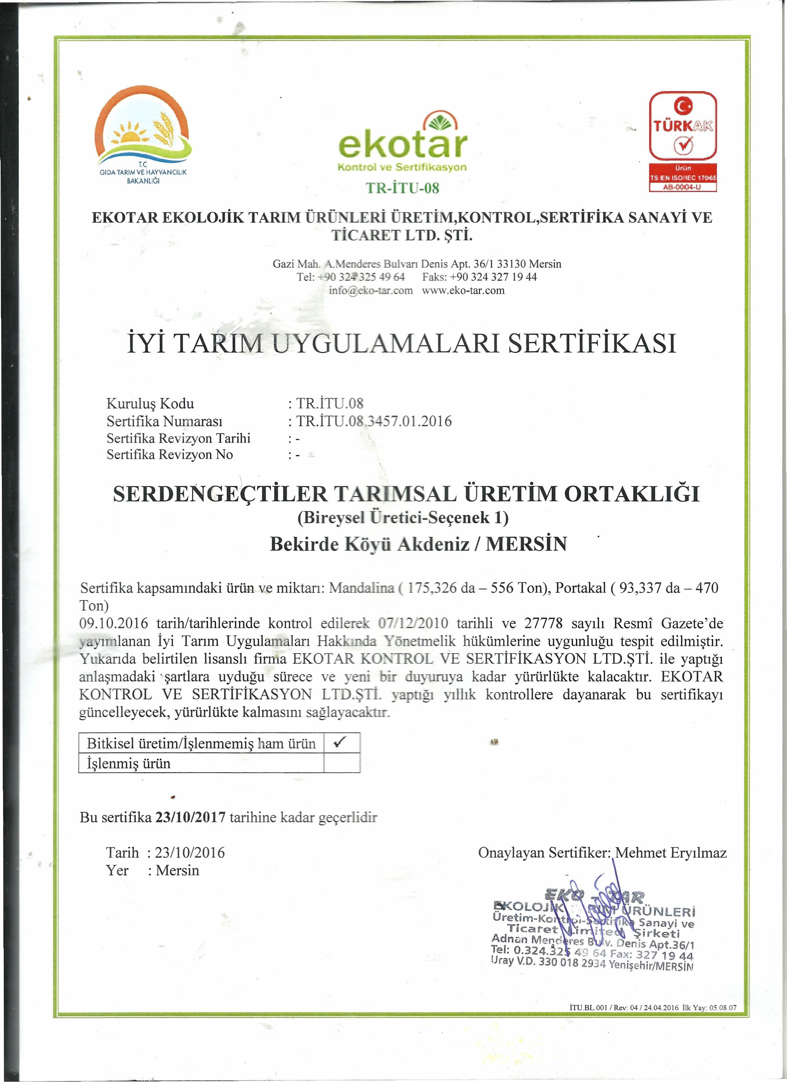 Serdengeçtiler Narenciye Tesisleri Kamil Serdengeçti tarafından 1900’lu yılların başında Müftü Deresi yanında satın almış olduğu arazilerde kurulmuştur. Cemil Serdengeçti Hikmet Serdengeçti ve Fevzi Serdengeçti ailenin ikinci nesli olarak narenciye işletmelerini geliştirmişlerdir. Halen üçüncü nesil işbaşındadır. Yıllık üretimimiz 1100 ton civarındadır. Serdengeçtiler Tarımsal üretim Ortaklığı 2005 yılında kurulmuş olup esas işi tarımsal üretim yapmaktır. Serdengeçtiler Tarım Sanayi ve Ticaret Ltd Şti. ise 2006 ylnda kurulmuş olup tarımsal üretimimizi tamamlayıcı ve geliştirici hizmetler vermektedir. İşletmemiz 300 dönüm civarında bir alanda faaliyet halindedir. Yeri itibarı ile Mersin Limanı’na 5 km, Hebilli kavşağı yanında yapılmakta olan büyük demir yolu yükleme alanına 500 mt ve halen inşaatı süren dünyanın en büyük lojistik hava alanlarından biri olan Tarsus Havaalanı’na da yakın bir noktada konumlanmıştır. İşletme girişi Adana Mersin ana arteri üzerinde yer alan ve Hebilli kavşağından girilen 35 metrelik Bekirde Caddesi üzerinde yer almaktadır.Tesisler ulaşım yönünden avantaj sağlamaktadır. Mevcut traktörlerimiz, zirai ilaçlama donanımlarımız, arazi düzenlemeye yönelik makinalarımız, kamyonet vs. ve işletmeye yönelik diğer donanımımızla her türlü gereksinimimizi karşılamaktadır.